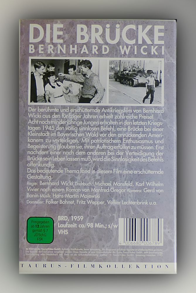 Video (VHS) Der berühmte und erschütternde von Bernhard Wicki aus den fünfziger Jahren erhielt zalreiche Preise! Acht minderjährige Jungen erhalten in den letzten Kriegstagen 1945 den völlig sinnlosen Befehl, eine Brücke bei einer Kleinstadt im Bayerischen Wald vor den anrückenden Amerikanern zu verteidigen. Mit patreotischem Enthusiasmus und Begeisterung glauben sie, ihren Auftrag erfüllen zu müssen. Erst nach dem einer nach dem anderen bei der Verteidigung der Brücke sein Leben lassen muß, wird die Sinnlosigkeit des Befehls offenkundig.