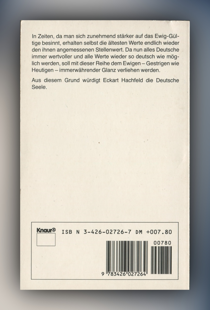 In Zeiten, da man sich zunehmend stärkeren das Ewig-Gültige besinnt, erhalten selbst die ältesten Werte endlich wieder den ihnen angemessenen Stellenwert. Da nun alles Deutsche immer wertvoller und alle Werte wieder so deutsch wie möglich werden, soll mit dieser Reihe dem Ewigen ?- Gestrigen wie Heutigen ? immerwährender Glanz verliehen werden. Aus diesem Grund würdigt Eckart Hachfeld die Deutsche Seele.