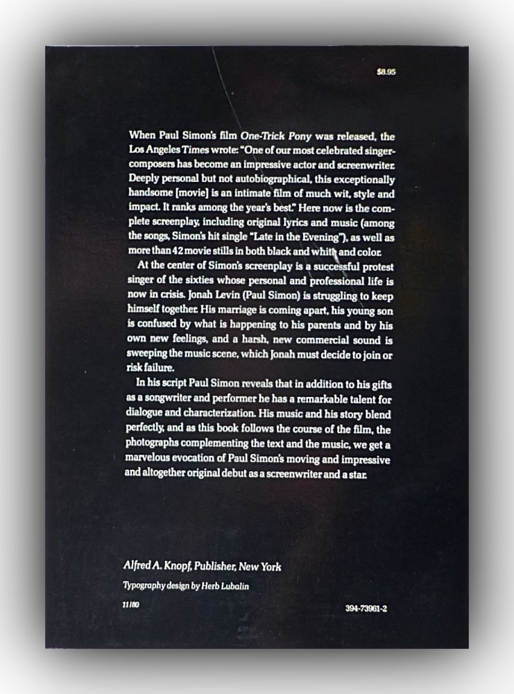 When Paul Simon's film One-Trick Pony was released, the Los Angeles Times wrote: «One of our most celebrated singer- composers has become an impressive actor and screenwriter Deeply personal but not autobiographical. this exceptionally handsome [movie] is an intimate film of much wit, style and impact. It ranks among the year's best.« Here now is the com- plete screenplay, including original lyrics and music (among the songs, Simon's hit single «Late in the Evening«), as well as. more than 42 movie stills in both black and white and color. At the center of Simon's screenplay is a successful protest singer of the sixties whose personal and professional life is now in crisis. Jonah Levin (Paul Simon) is struggling to keep himself together: His marriage is coming apart. his young son is confused by what is happening to his parents and by his own new feelings. and a harsh. new commercial sound is sweeping the music scene. which Jonah must decide to join or risk failure. In his script Paul Simon reveals that in addition to his gifts as a songwriter and performer he has a remarkable talent for dialogue and characterization. His music and his story blend perfectly and as this book follows the course of the film. the photographs complementing the text and the music, we get a marvelous evocation of Paul Simon's moving and impressive and altogether original debut as a screenwriter and a star Typography design by Herb Lubalin