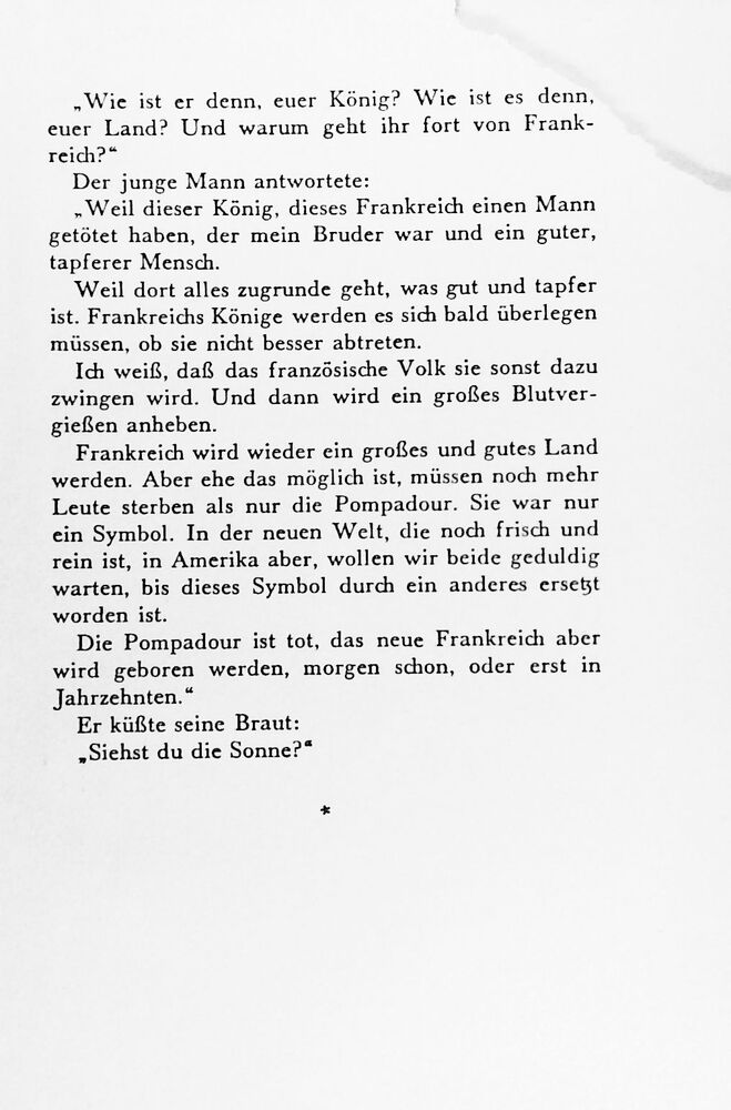 Frankreich wird wieder ein großes und gutes Land werden. Aber ehe das möglich ist, müssen noch mehr Leute sterben als nur die Pompadour. Sie war nur ein Symbol. In der neuen Welt, die noch frisch und rein ist, in Amerika aber, wollen wir beide geduldig warten, bis dieses Symbol durch ein anderes ersetzt worden ist.