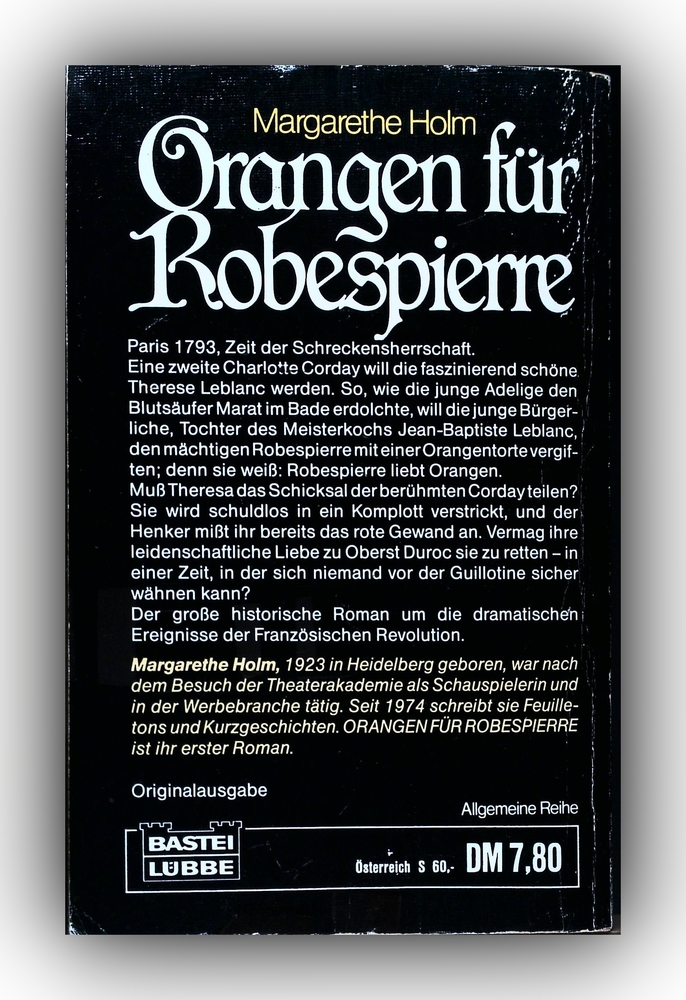 Margarethe Holm, 1923 in Heidelberg geboren, war nach dem Besuch der Theaterakademie als Schauspielerin und in der Werbebranche tätig. Seit 1974 schreibt sie Feuilletons und Kurzgeschichten. ORANGEN FÜR ROBESPIERRE ist ihr erster Roman.