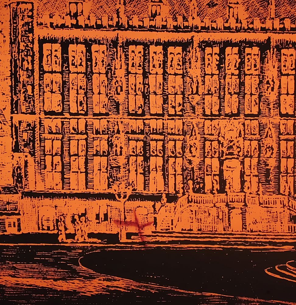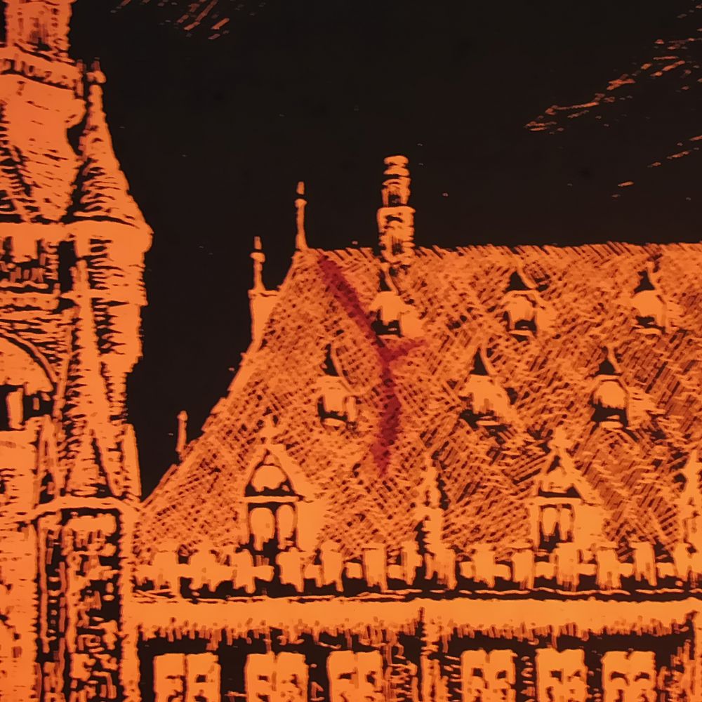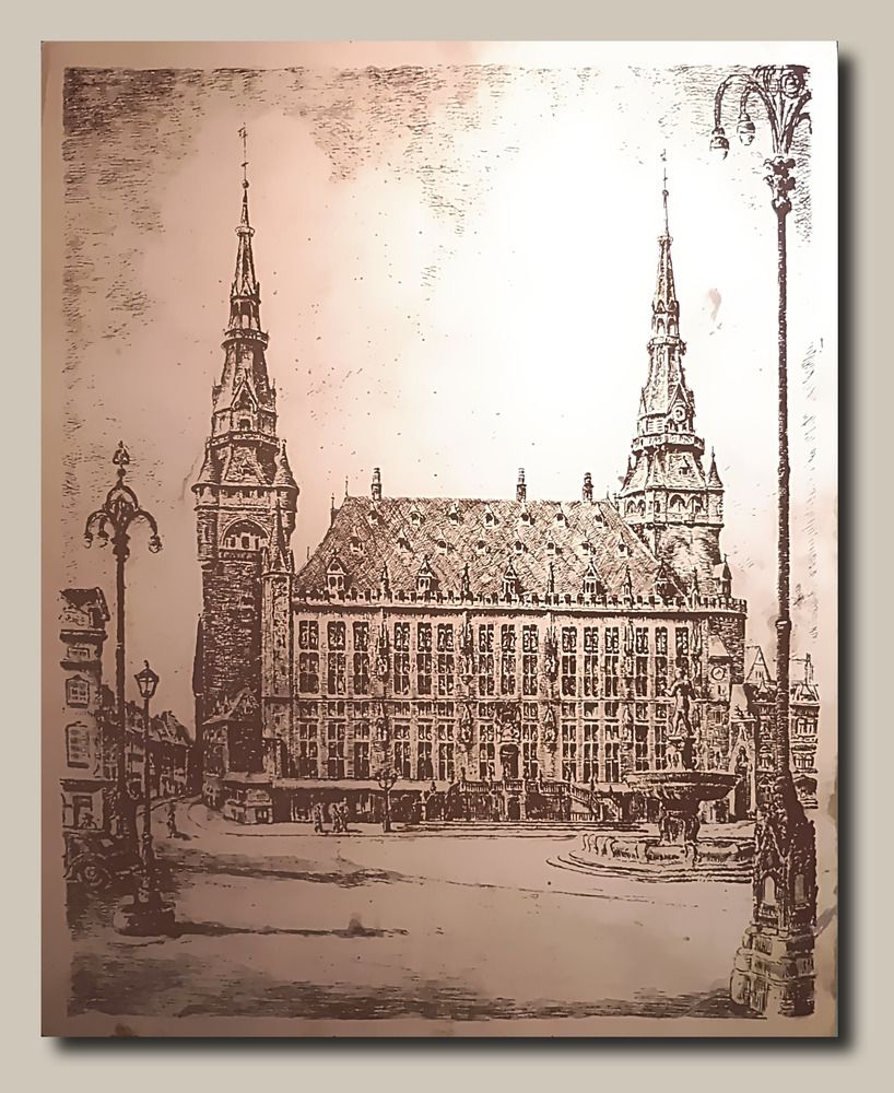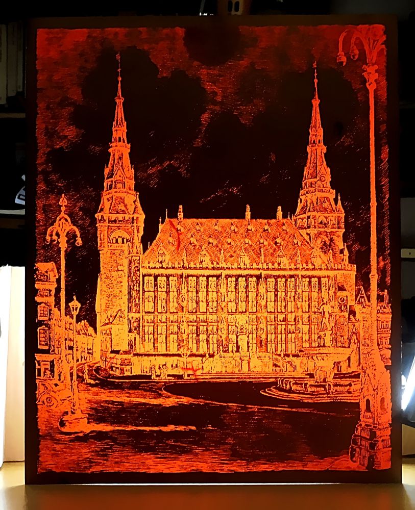 auf der Rückseite ist ein Aufhänger aufgeklebt, müßte erneuert oder besser gerahmt werden, mit einer Hintergrundbeleuchtung (nicht dabei) wirkt das Rathaus beleuchtet, im Pertinax sind ein paar Fehler, die aber nur mit der Hintergrundbeleuchtung sichtbar werden.