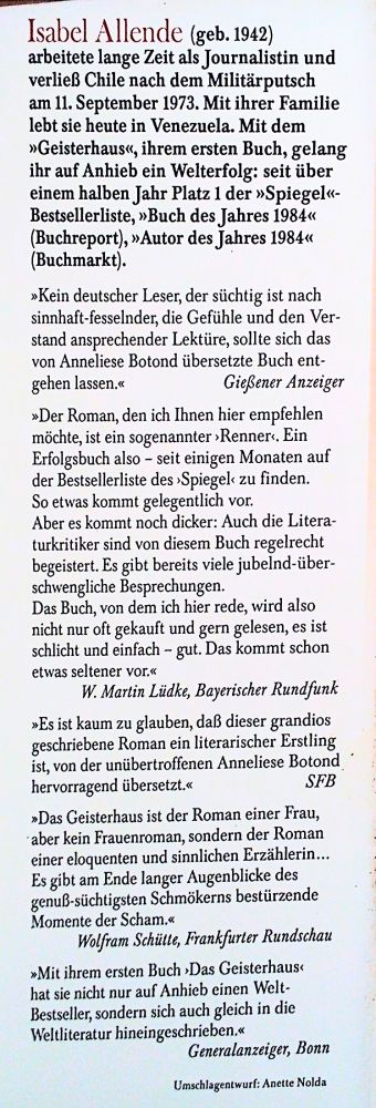 »Isabel Allendes erster großer Roman, eine Familienchronik aus Chiles Hauptstadt Santiago und der monströsen Villa des Gutsbesitzers Esteban Trueba, ist ein literarisches und politisches Ereignis ersten Ranges.«