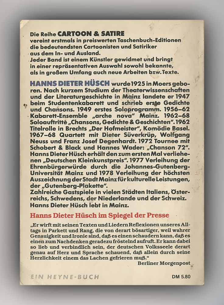 HANNS DIETER HÜSCH wurdel925 in Moers geboren. Nach kurzem Studium der Theaterwissenschaften und der Literaturgeschichte in Mainz landete er 1947 beim Studentenkabarett und schrieb erste Gedichte und Chansons. 1949 erstes Soloprogramm. 1956« 62 Kabarett-Ensemble »arche nova« Mainz. 1962-68 Soloauftritte»Chansons, Gedichte & Geschichten« . 1962 Titelrolle in Brechts »Der Hofmeister« , Komödie Basel. 1967-68 Quartett mit Dieter Süverkrüp, Wolfgang Neuss und Franz Josef Degenhardt. 1972 Tournee mit Schobert & Black und Hannes Wader: »Chanson 72« . Hanns Dieter Hüsch erhält den zum ersten Mal verliehenen»Deutschen Kleinkunstpreis« . 1977 Verleihung der Ehrenbürgerwürde durch die Johannes-Gutenberg- Universität Mainz und 1978 Verleihung der höchsten Auszeichnung der Stadt Mainz für kulturelle Leistungen, der»Gutenberg-Plakette« . ; Zahlreiche Gastspiele in vielen Städten Italiens, Österreichs, Schwedens, der Niederlande und der Schweiz. Hanns Dieter Hüsch lebt in Mainz.