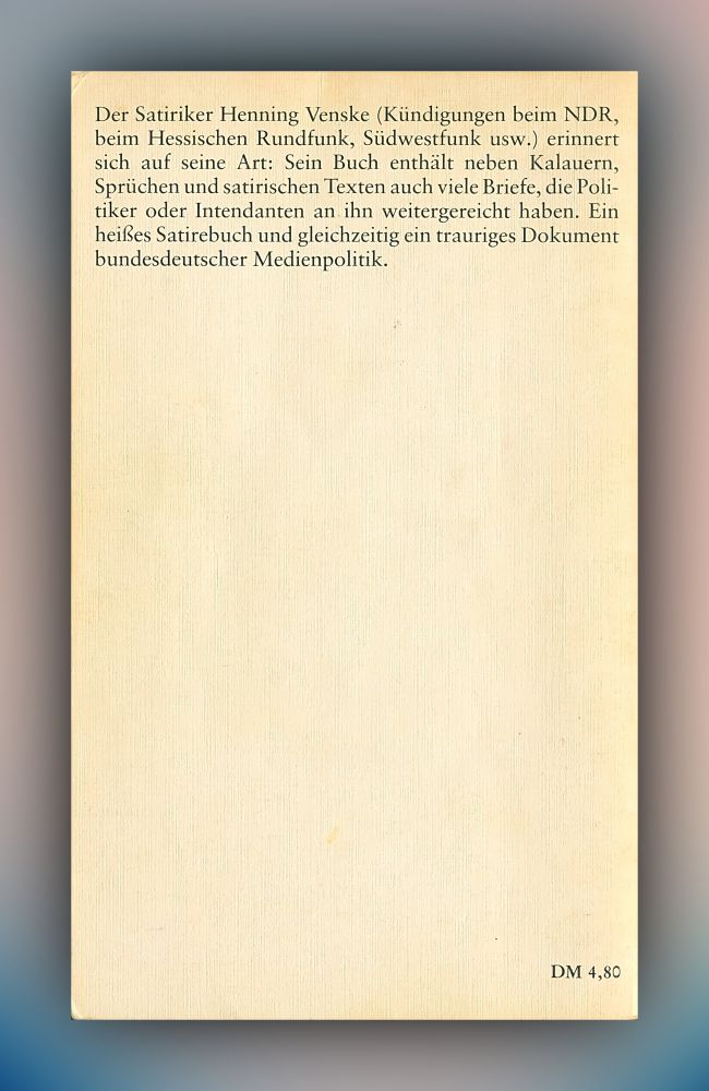 Der Satiriker Henning Venske (Kündigungen beim NDR, beim Hessischen Rundfunk, Südwestfunk usw.) erinnert sich auf seine Art. Sein Buch enthält neben Kalauern, Sprüchen und satirischen Texten auch viele Briefe, die Politiker oder Intendanten an ihn weitergereicht haben. Ein heißes Satirebuch und gleichzeitig ein trauriges Dokument bundesdeutscher Medienpolitik.