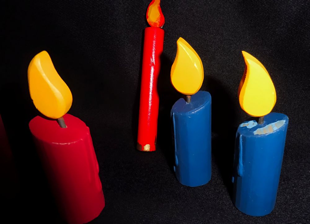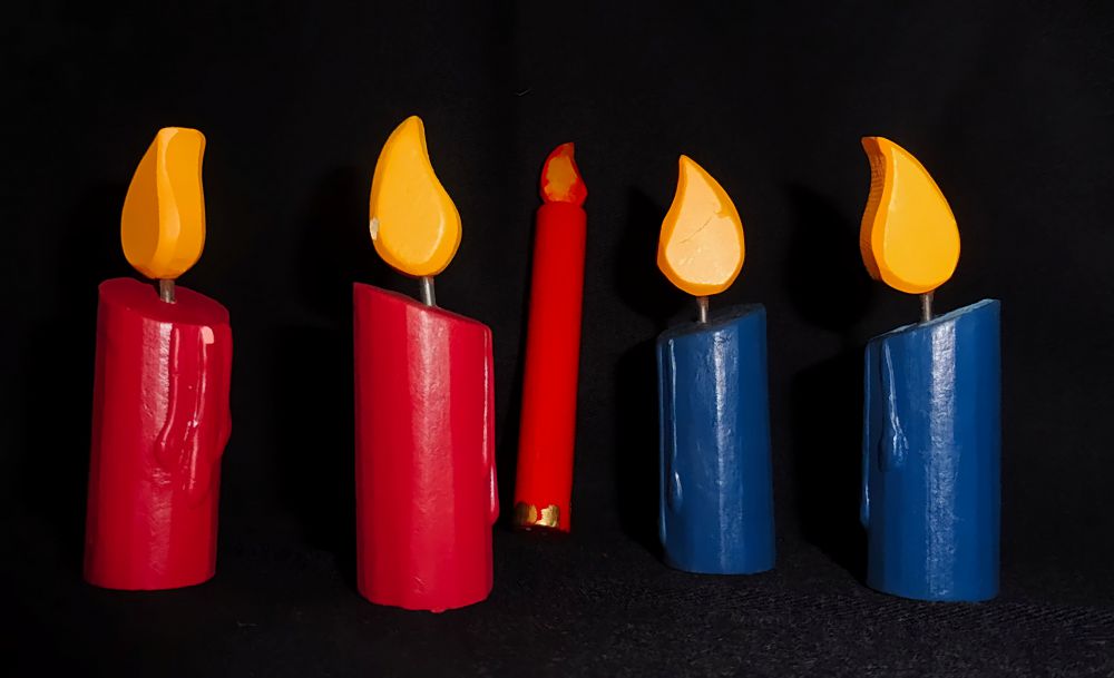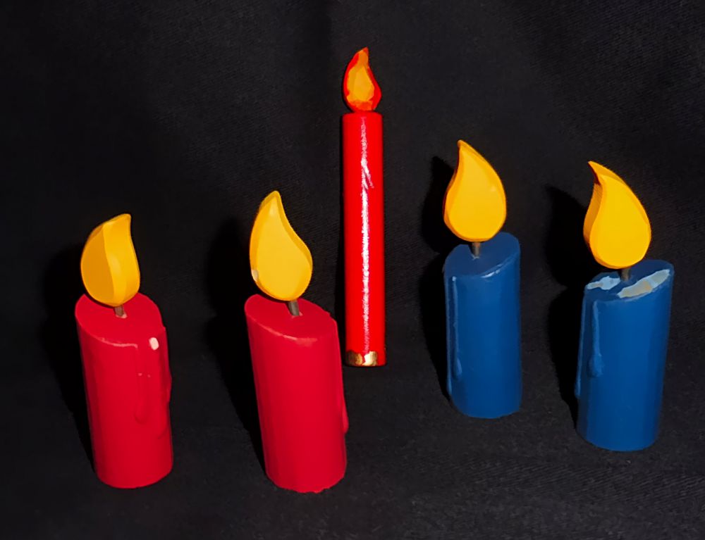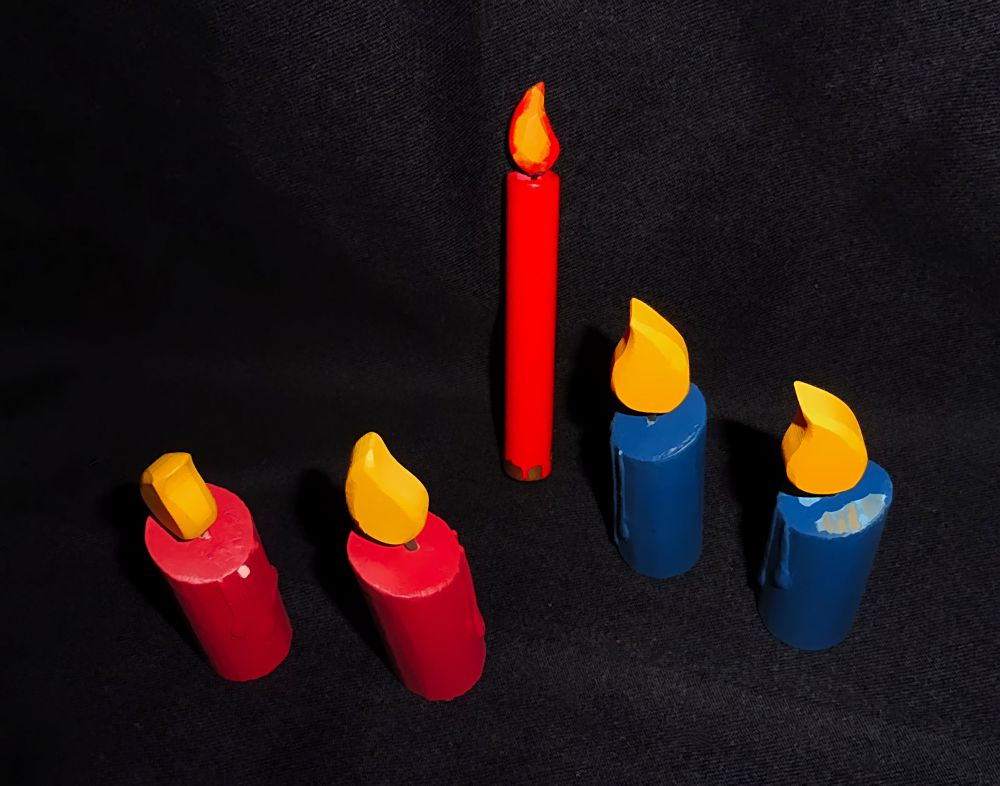 4 x Durchmesser 2 cm, 8 cm hoch, 2 rot, 2 blau, unten mit Bohrung für Dorn