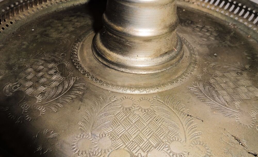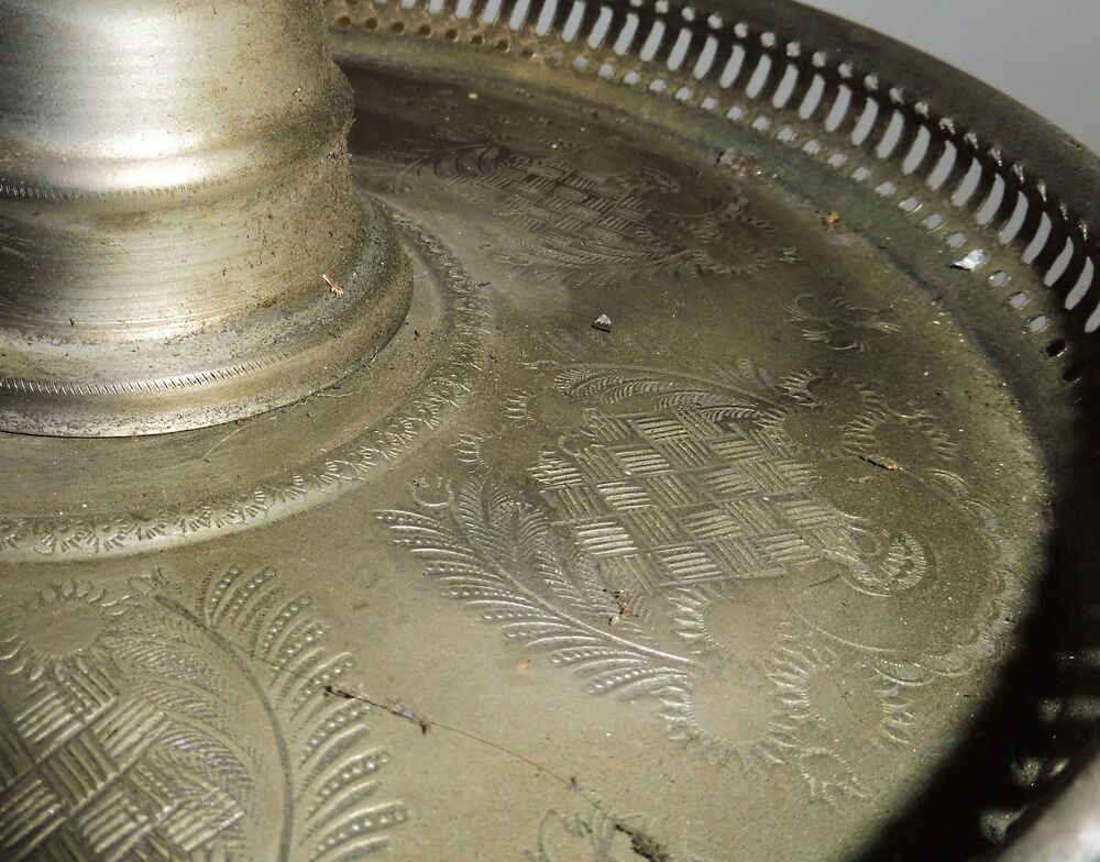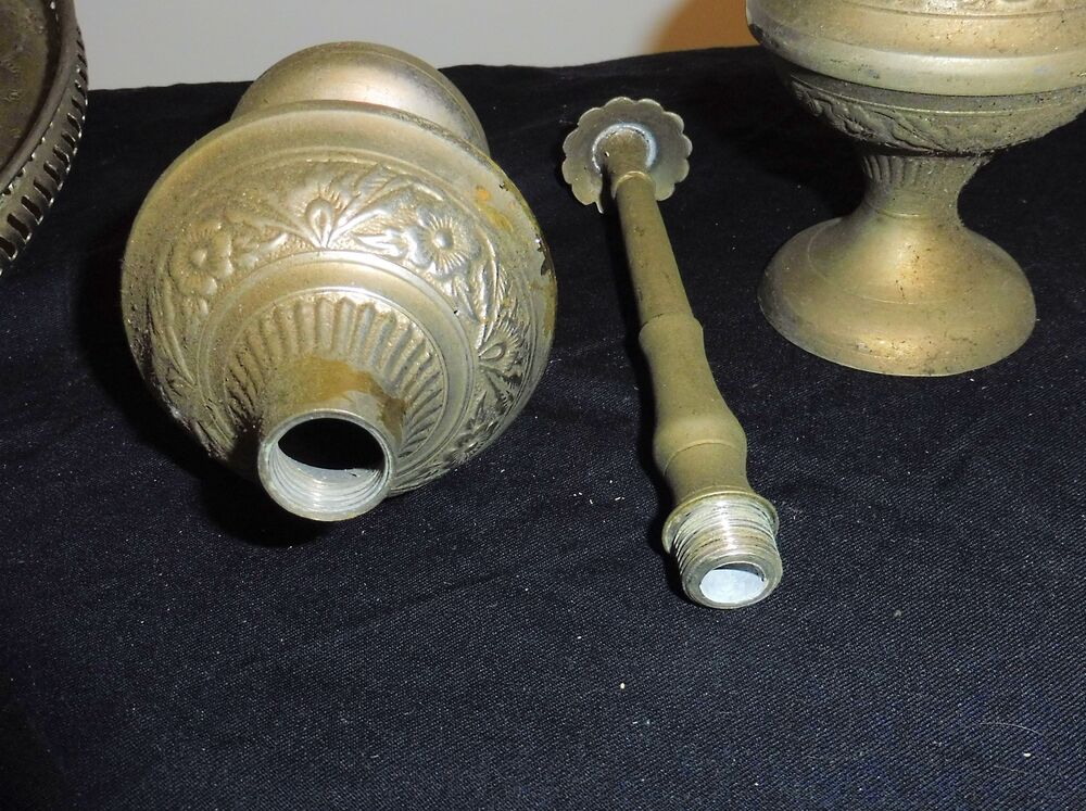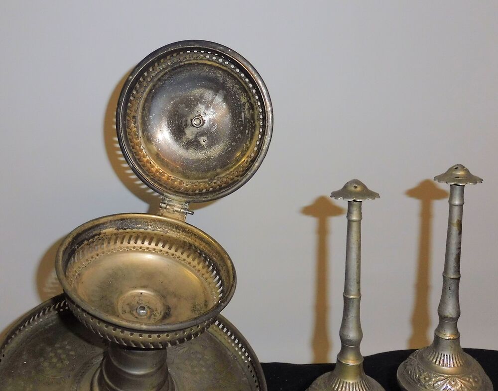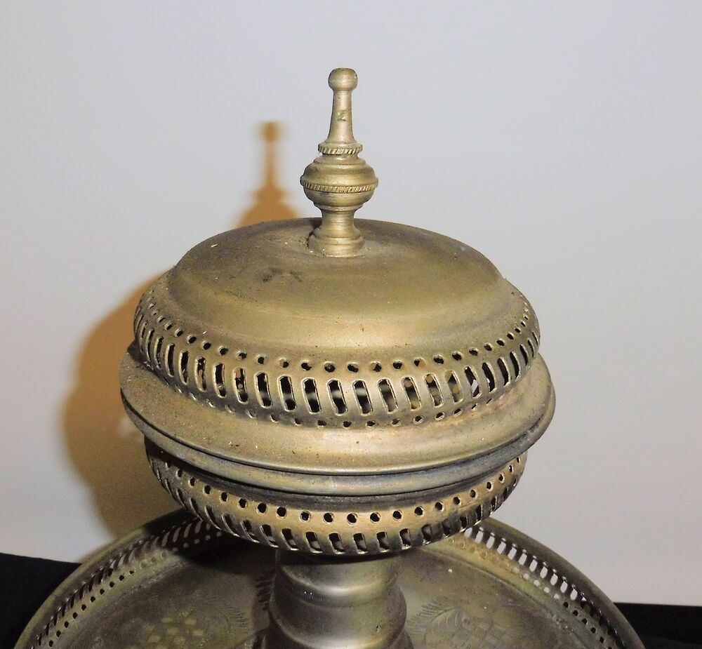 Messing ziseliert, der große Teller hat einen Durchmesser von 250 mm, das aufklappbare Räucherfach 140 mm, Gesamthöhe 300 mm, bei Versand zerlegt, wird mit Gewindestange (nicht original) zusammengebaut. Die beiden kleinen Gefäße, jeweils Durchmesser 70 mm, 250 mm hoch