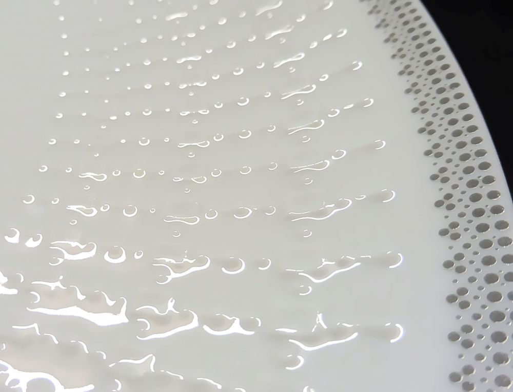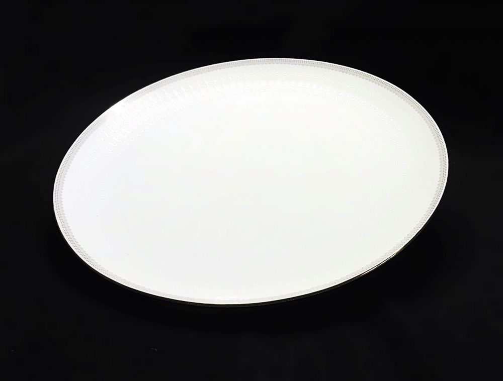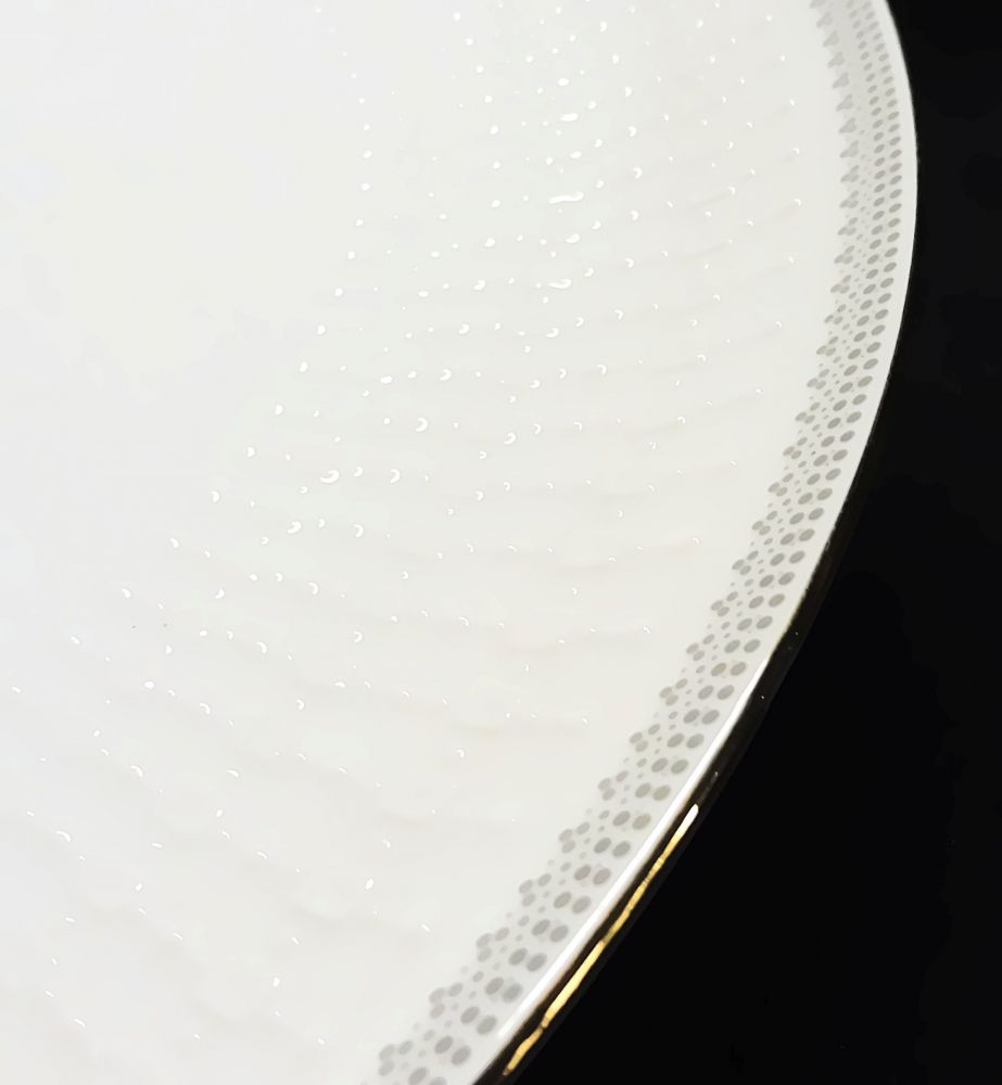 Goldrand, Innenrandfläche ebenfalls etwa 1 cm mit Goldverzierung, restliche Randfläche Muster im Porzellan