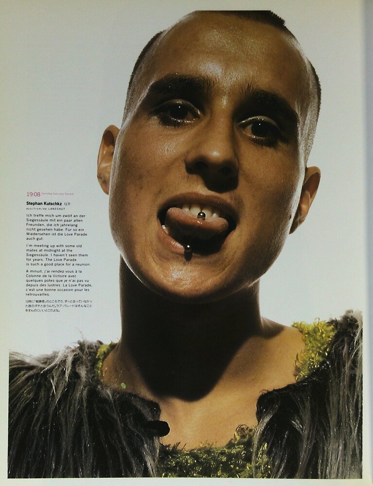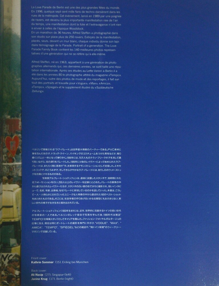 Die Love Parade in Berlin 1996 war die größte Party der Weit. Eine dreiviertel Million tanzender Techno-Begeisterter zog durch die Straßen der Metropole. Längst hat sich dieses Event. das 1989 von einer Handvoll Ravern ins Leben gerufen wurde, zu der massivsten Demonstration eines Lebensgefühls gesteigert. das in seiner Exzentrik und Scheitelhöhe der Woodstock-Ära in nichts nachsteht. Der Fotograf Alfred Steffen hat in einem 36stündigen Foto-Marathon in einerm Studio vor Ort mehr als 250 Raver porträtiert. Sie wurden aus der Massenveranstaltung herausgezogen und isoliert vor einer weißen Wand abgelichtet: individuelle Persönlichkeiten. die in einem Kurzinterview ein Statement zur Parade abgeben. Portrait of a generation. The Love Parade Family Book zeigt 140 der besten Aufnahmen und gibt so einen Querschnitt der Generation, die fernab aller soziologischen Erklärungsmodelle für sich selbst steht. Alfred Steffen. geb. 1963, gehört zu einer Generation von deutschen Fotografen, die sich in den letzten Jahren auch international einen Namen gemacht hat. Nach seiner Ausbildung im Lette-Verein in Berlin arbeitete er in den 80er Jahren fest für das Magazin »Tempo«. Heute ist er neben Modeaufnahmen und Reportagen vor allen auf Porträts spezialisiert und fotografiert für »Vogue«, »Max«, »Amica«, »Ternpo«, »Spiegel« und das Magazin der »Süddeutschen Zeitung. Die Love Parade in Berlin 1996 war die größte Party der Weit. Eine dreiviertel Million tanzender Techno-Begeisterter zog durch die Straßen der Metropole. Längst hat sich dieses Event. das 1989 von einer Handvoll Ravern ins Leben gerufen wurde, zu der massivsten Demonstration eines Lebensgefühls gesteigert. das in seiner Exzentrik und Scheitelhöhe der Woodstock-Ära in nichts nachsteht. Der Fotograf Alfred Steffen hat in einem 36stündigen Foto-Marathon in einerm Studio vor Ort mehr als 250 Raver porträtiert. Sie wurden aus der Massenveranstaltung herausgezogen und isoliert vor einer weißen Wand abgelichtet: individuelle Persönlichkeiten. die in einem Kurzinterview ein Statement zur Parade abgeben. Portrait of a generation. The Love Parade Family Book zeigt 140 der besten Aufnahmen und gibt so einen Querschnitt der Generation, die fernab aller soziologischen Erklärungsmodelle für sich selbst steht. Alfred Steffen. geb. 1963, gehört zu einer Generation von deutschen Fotografen, die sich in den letzten Jahren auch international einen Namen gemacht hat. Nach seiner Ausbildung im Lette-Verein in Berlin arbeitete er in den 80er Jahren fest für das Magazin »Tempo«. Heute ist er neben Modeaufnahmen und Reportagen vor allen auf Porträts spezialisiert und fotografiert für »Vogue«, »Max«, »Amica«, »Ternpo«, »Spiegel« und das Magazin der »Süddeutschen Zeitung.