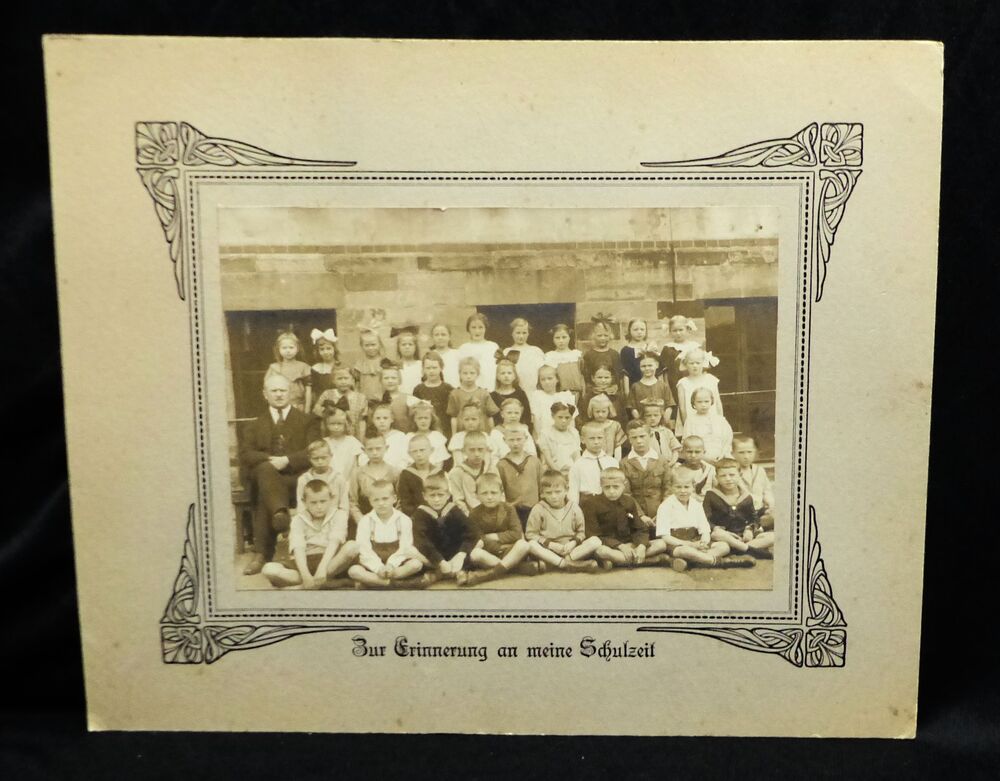 - Motiv: Schulkinder nach Mädchen und Jungen in Reihen geordnet und grimmig dreinblickendem Lehrer