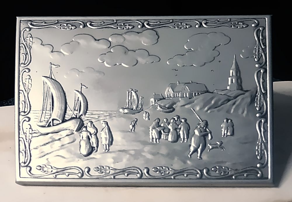Motiv: Szene mit Menschen am Meeresufer, dazu Segelschiffe, Häuser, Kirche und Wolken, mit rankenden Ornamenten umrahmt
