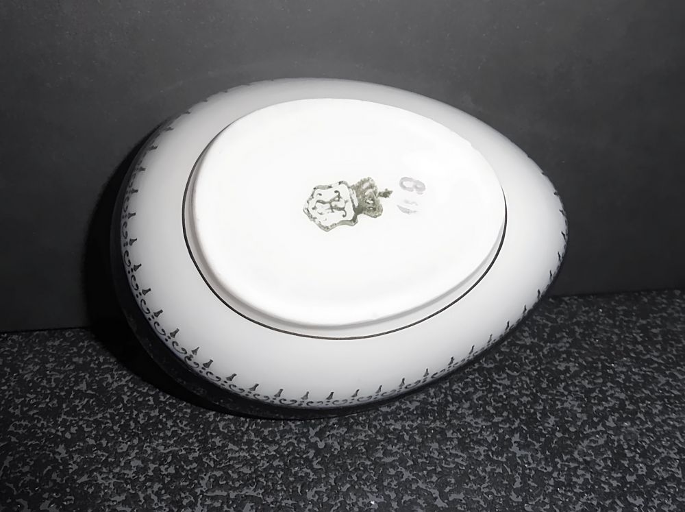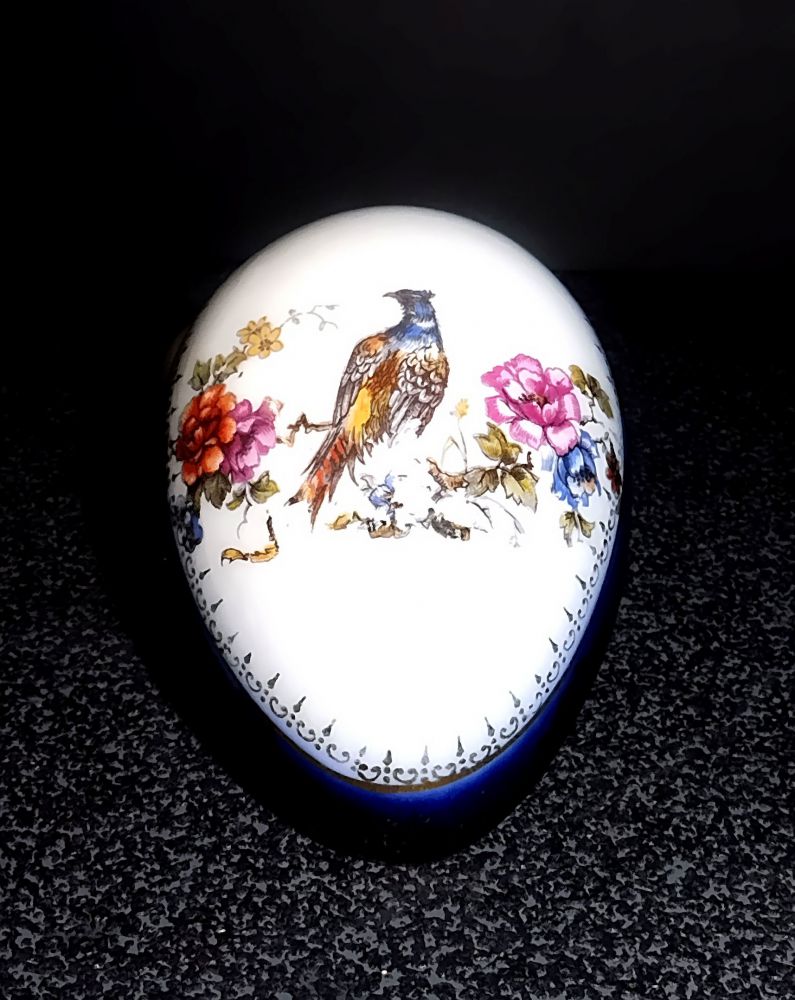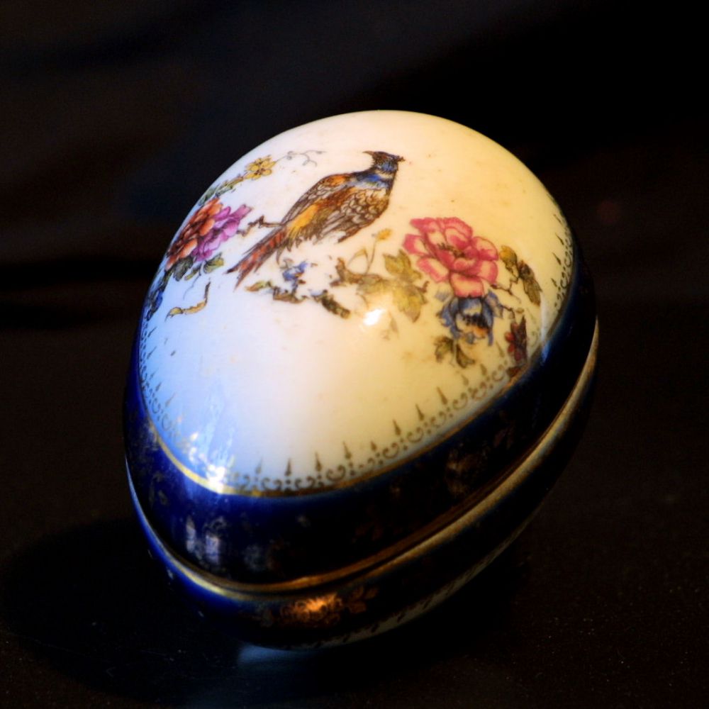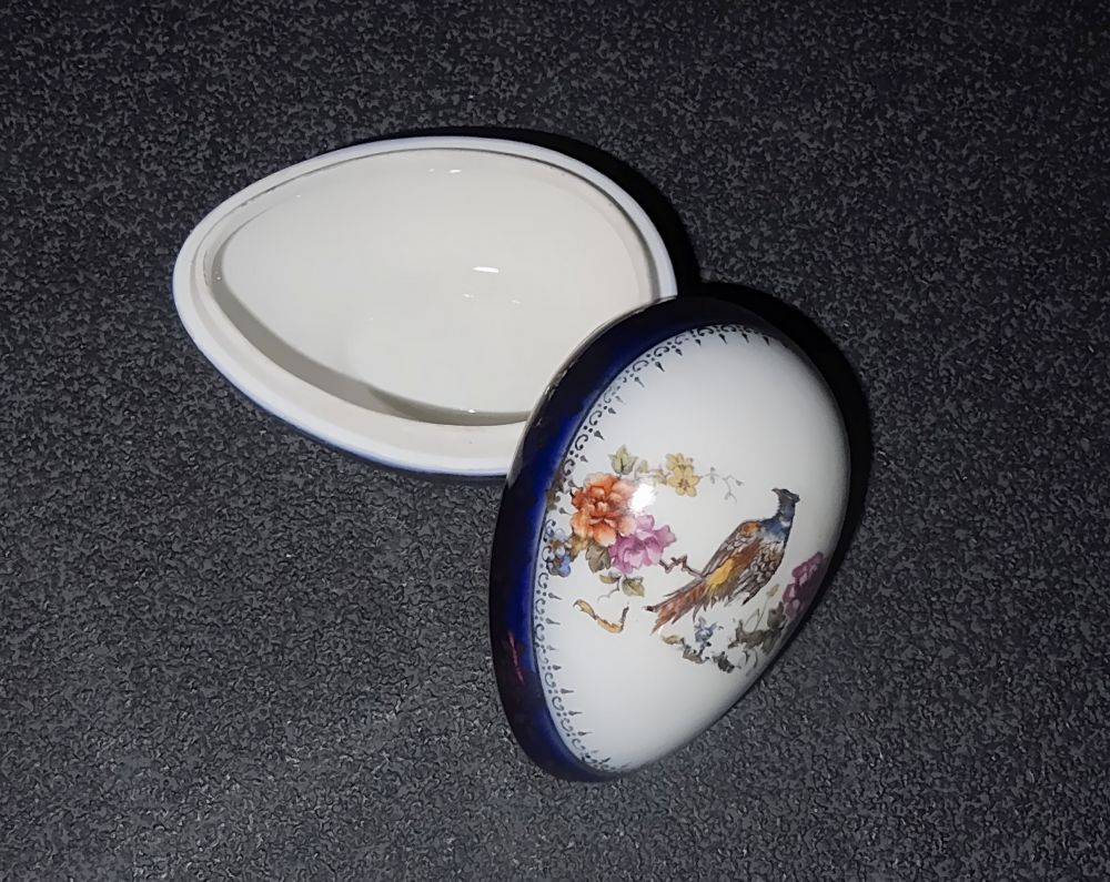 Porzellandose in Ei-Form mit Blüten- und Vogelmotiv