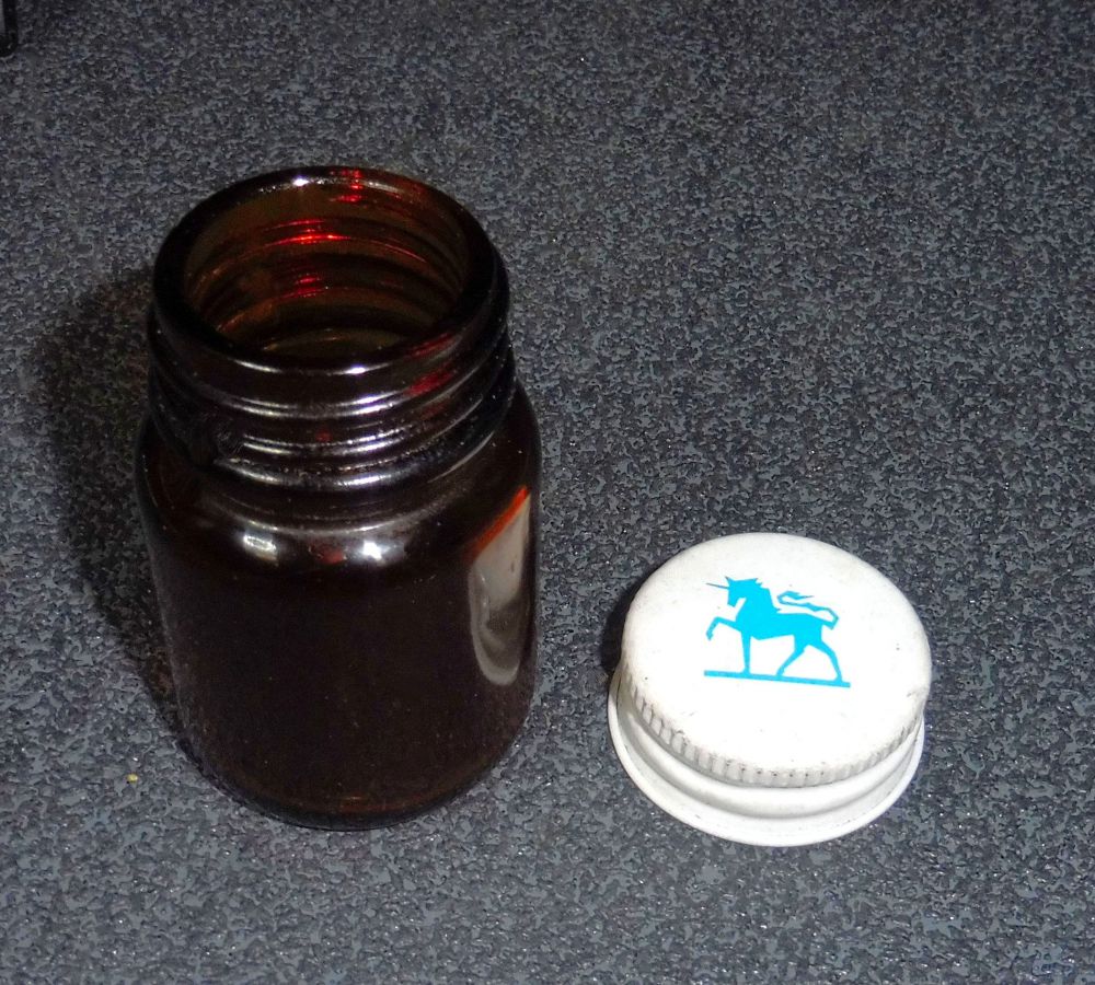 Apothekenglas Braunglas mit Einhorn im Deckel 4 x 6 cm