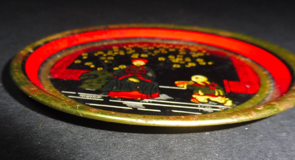 Blechteller mit Mandarin in chinesischem Gewand, dem Essen in einer Schale gebracht wird