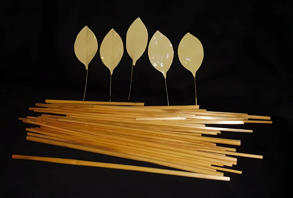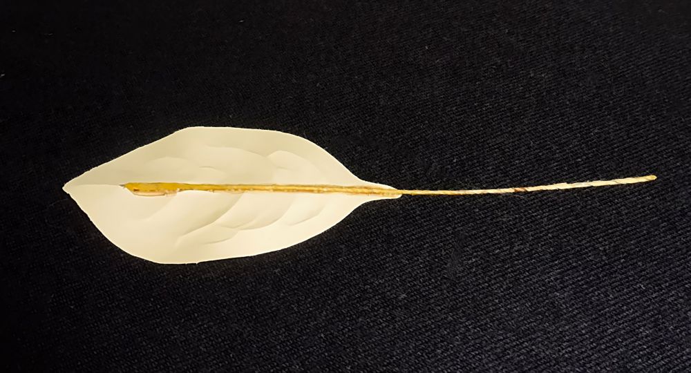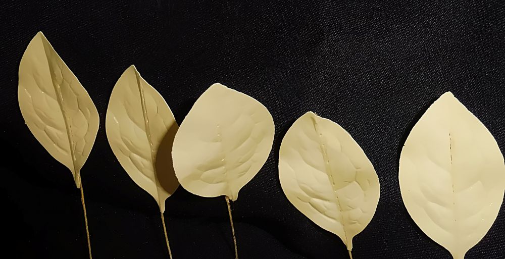 Blätter cremefarbener Kunststoff glänzend,3 x 6 cm, mit rückseitig angeklebtem Draht
