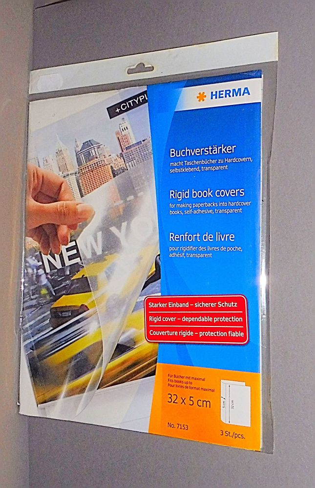 aus selbstklebender transparenter Folie. Zum Verstärken von weichen Bucheinbänden - macht Taschenbücher zu Hardcovern
