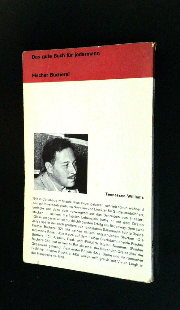 1914 in Columbus im Staate Mississippi geboren, schrieb schon während seines Universitätsstudiums Novellen und Einakter für Studentenbühnen, , verlegte sich dann aber vorwiegend auf das Schreiben von Theaterstücken. In seinem dreißigsten Lebensjahr hatte er mit dem Drama »Glasmenagerie« einen durchschlagenden Erfolg am Broadway, dem zwei Jahre später der noch größere von »Endstation Sehnsucht« folgte (beide Fischer Bücherei 52). Mit seinen danach entstandenen Stücken »Die tätowierte Rose«, »Die Katze auf dem heißen Blechdach« (beide Fischer Bücherei 110), »Camino Real« und »Plötzlich letzten Sommer« (Fischer Bücherei 363) hat er seinen Ruf als einer der führenden Dramatiker der Gegenwart gefestigt. Sein erster Roman »Mrs. Stone und ihr römischer Frühling« (Fischer Bücherei 443) wurde erfolgreich mit Vivian Leigh in der Hauptrolle verfilmt.