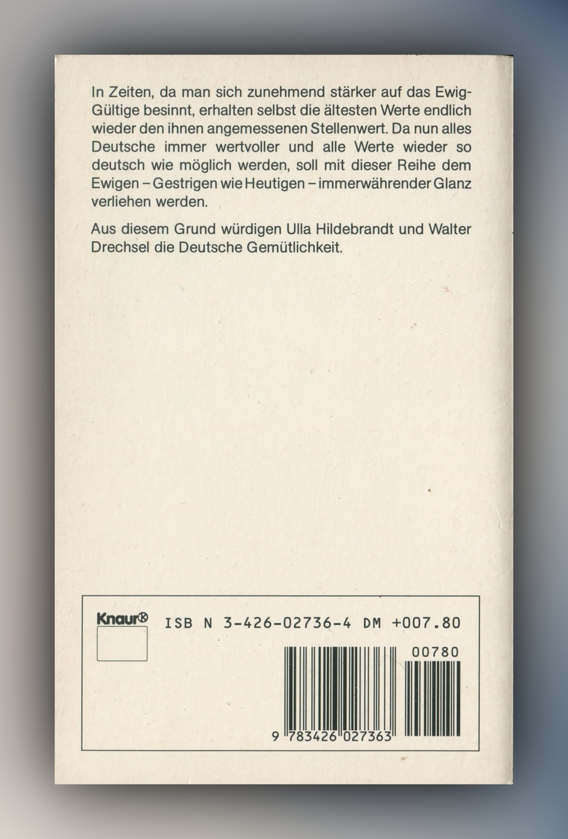 In Zeiten, da man sich zunehmend stärker auf das Ewiggültige besinnt, erhalten selbst die ältesten Werte endlich wieder den ihnen angemessenen Stellenwert. Da nun alles Deutsche immer wertvoller und alle Werte wieder so deutsch wie möglich werden, soll mit dieser Reihe dem Ewigen ? Gestrigen wie Heutigen ? immerwährender Glanz verliehen werden. Aus diesem Grund würdigen Ulla Hildebrandt und Walter Drechsel die Deutsche Gemütlichkeit.