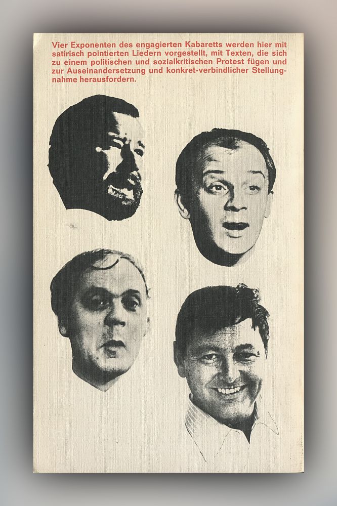 »Vier Exponenten des engagierten Kabaretts werden hier mit satirisch pointierten Liedern vorgestellt, mit Texten, die sich zu einem politischen und sozialkritischen Protest fügen und zur Auseinandersetzung und konkret-verbindlicher Stellungnahme herausfordern.«