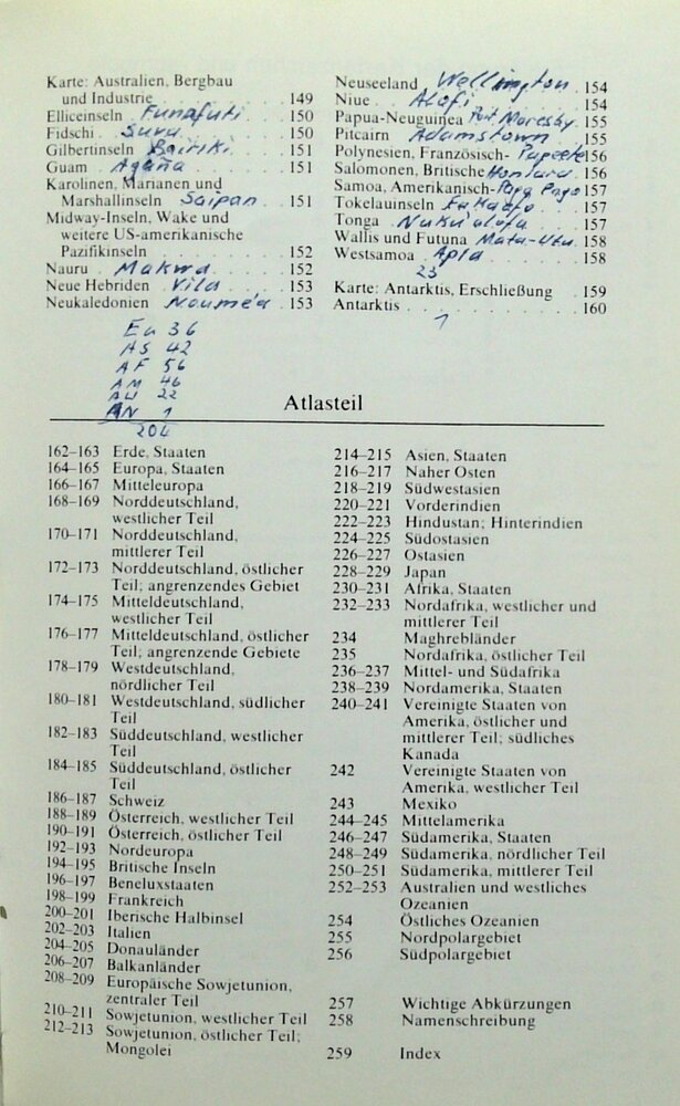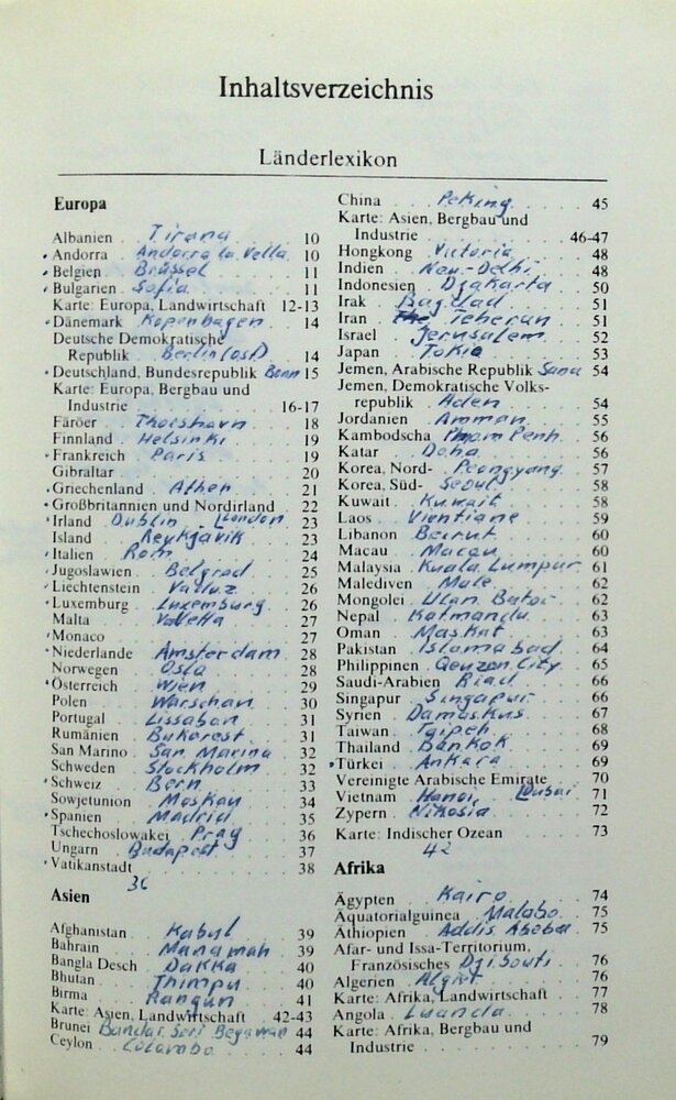 eigene handschriftliche Eintragung der Hauptstadtnamen im Länder-Inhaltsverzeichnis (Stand ~1980, ohne Gewähr)