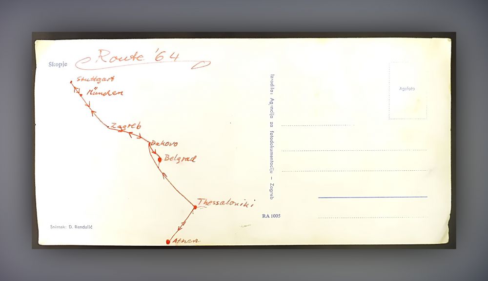 Ungelaufen,aber auf der Adresseite mit rotem Kugelschreiber die Strecke Stuttgart - Athen skizziert, Überschrift: Route '64, also wahrscheinlich aus dem Jahre 1964 oder früher.