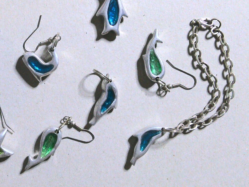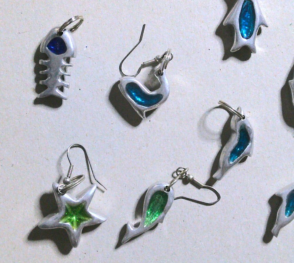 4 mit Fischerhaken (nickelfrei) als Ohrhänger, 4 mit Ring als Kettenanhänger, davon einer mit Armkette