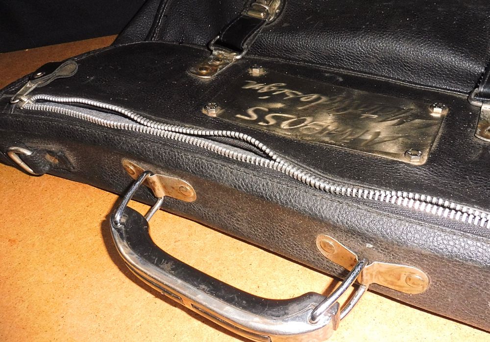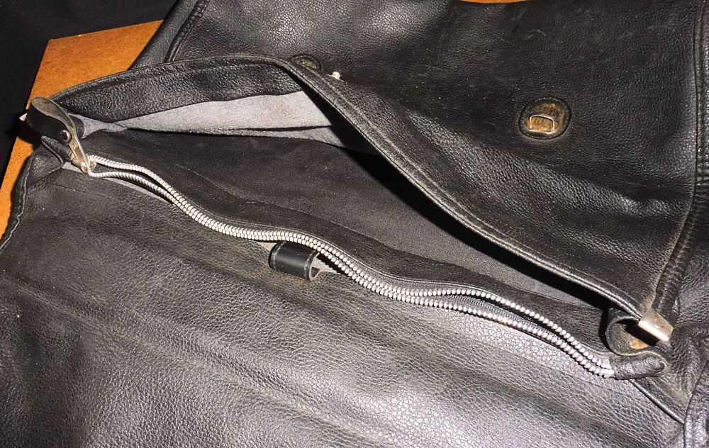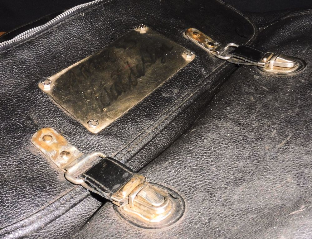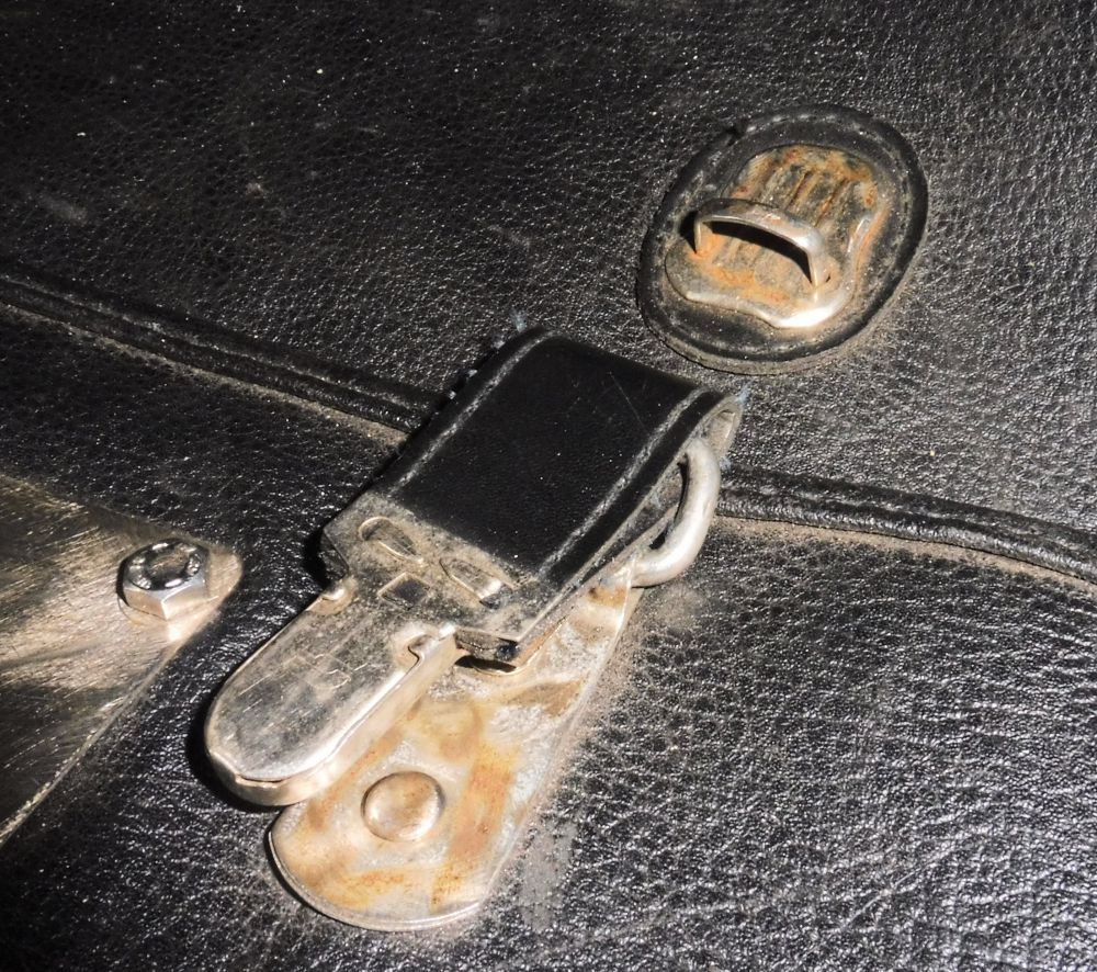 drei Innenfächer, davon eine mit Reißverschluß, ein Außenfach ebenfalls mit Reißverschluß und mit angeschraubtem Edelstahlschild, Aufschrift: AMBOSS Metalldesign