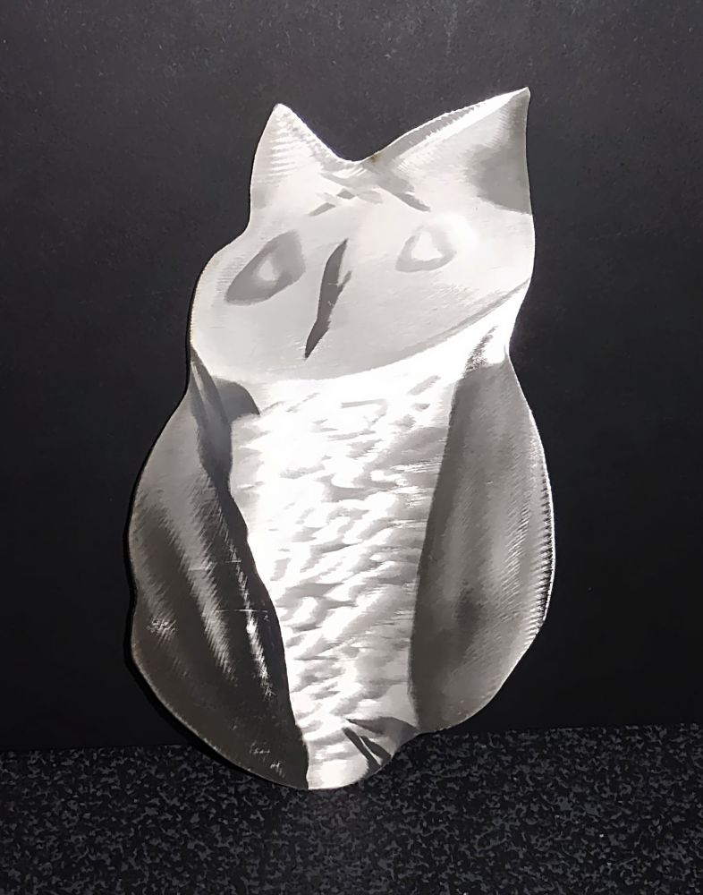 0,8 mm Edelstahlblech mit dem handgeführten Plasmaschneider ausgeschnitten und mit der Flex (Winkelschleifer) bearbeitet, nur Vorderseite, auf der Rückseite mit Öse zum aufhängen an der Wand, für Innen und Außen geeignet