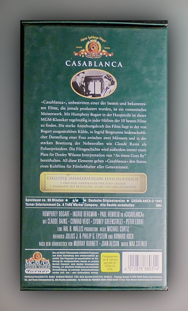 Video (VHS) »Casablanca«, unbestritten einer der besten und bekanntesten Filme, die jemals produziert wurden, ist ein romantisches Meisterwerk. Mit Humphrey Bogart in der Hauptrolle ist dieser MGM-Klassiker regelmäßig in jeder Hitliste der 10 besten Filme zu finden. Die starke Anziehungskraft des Films liegt in der von Bogart ausgestrahlten Kühle, in Ingrid Bergmanns leidenschaftlicher Darstellung einer Frau zwischen zwei Männern und in der starken Besetzung der Nebenrollen wie Claude Raius als Polizeipräsident. Die Filmgeschichte wird außerdem immer einen Platz für Dooley Wilsons Interpretation von »As times Goes By« bereithalten. All diese Elemente geben »Casablanca« den Status eines Kultfilms für Filmliebhaber aller Generationen.