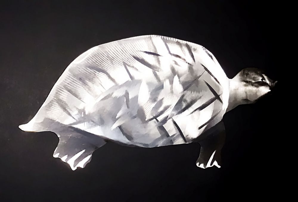 0,8 mm Edelstahlblech mit dem handgeführten Plasmaschneider ausgeschnitten und mit der Flex (Winkelschleifer) bearbeitet, nur Vorderseite, auf der Rückseite mit Öse zum aufhängen an der Wand, für Innen und Außen geeignet
