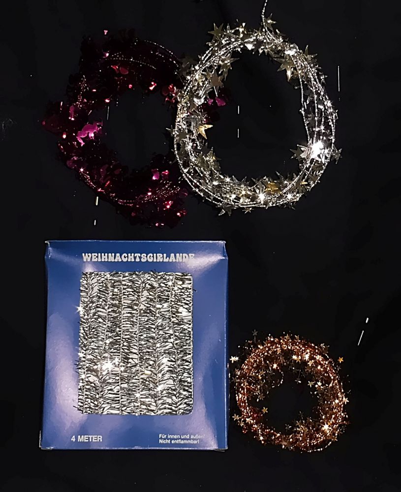 Weihnachtsdekoration 1 x 4 Meter Lametta silbern, OVP 1 x silberne Sterne an Draht 1 x goldene Sterne an Draht 1 x posaunende Putten weinrot an Draht