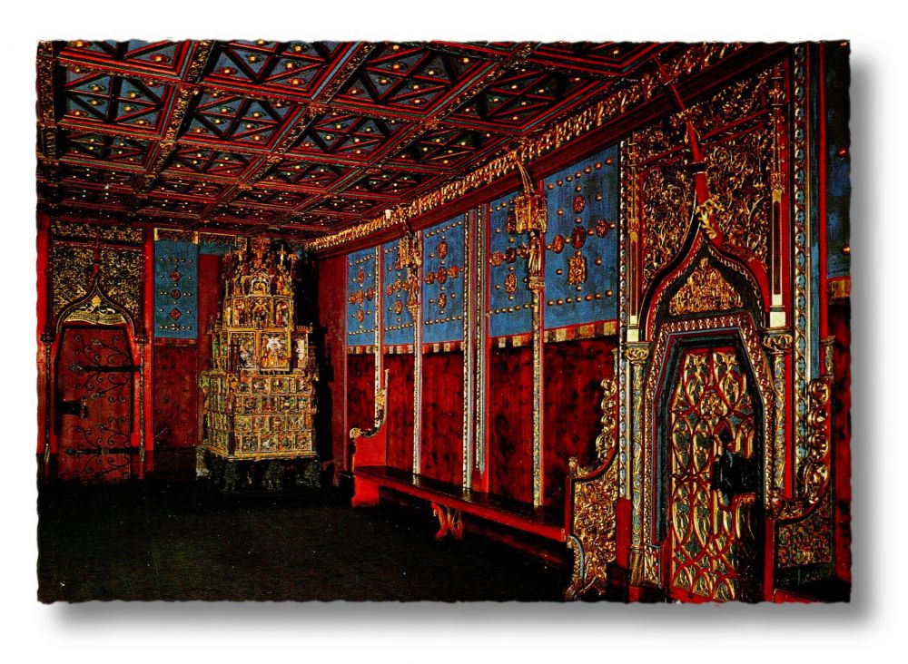 - Motiv: nobler Innenraum mit Wand- und Deckentäfelung und Ofen