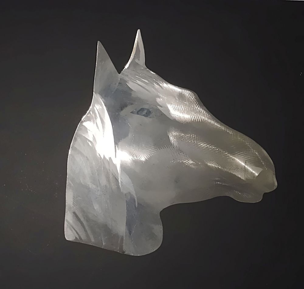 0,8 mm Edelstahlblech mit dem handgeführten Plasmaschneider ausgeschnitten und mit der Flex (Winkelschleifer) bearbeitet, nur Vorderseite, auf der Rückseite mit Öse zum aufhängen an der Wand, für Innen und Außen geeignet